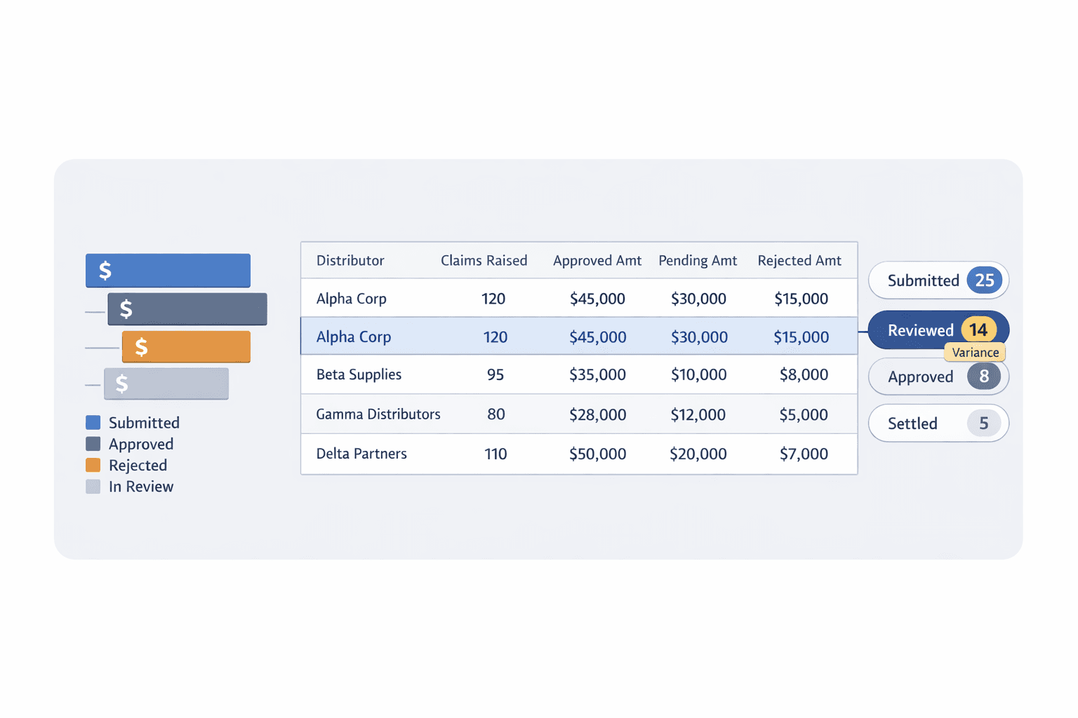 Gain complete visibility into claim status across workflow stages, along with distributor-level insights into claim amounts raised, approved, rejected, and pricing variability.