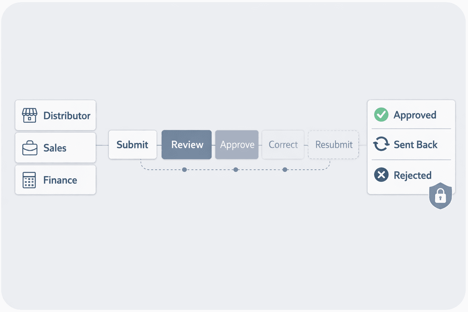 Configure approval, rejection, correction, and resubmission flows across distributors, sales, and finance – without rigid, one-size-fits-all processes.