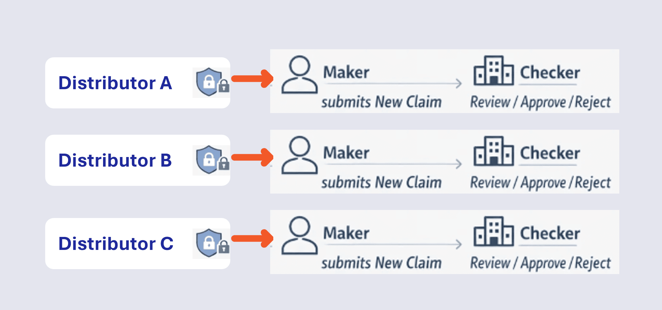 Provide each distributor access to an MFA-enabled portal where they view only their claims across periods and initiate new claims via controlled maker–checker workflow.