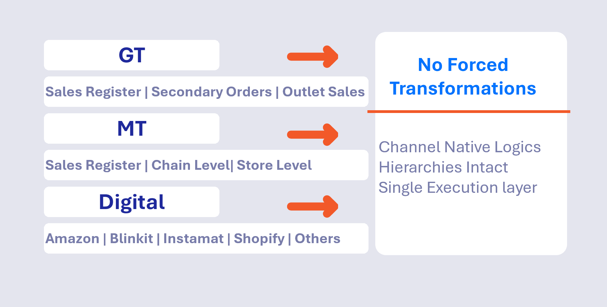 Maintain GT, MT, E-commerce, and ERP data within a single platform, while preserving each channel’s native structures, hierarchies, and reporting logic.