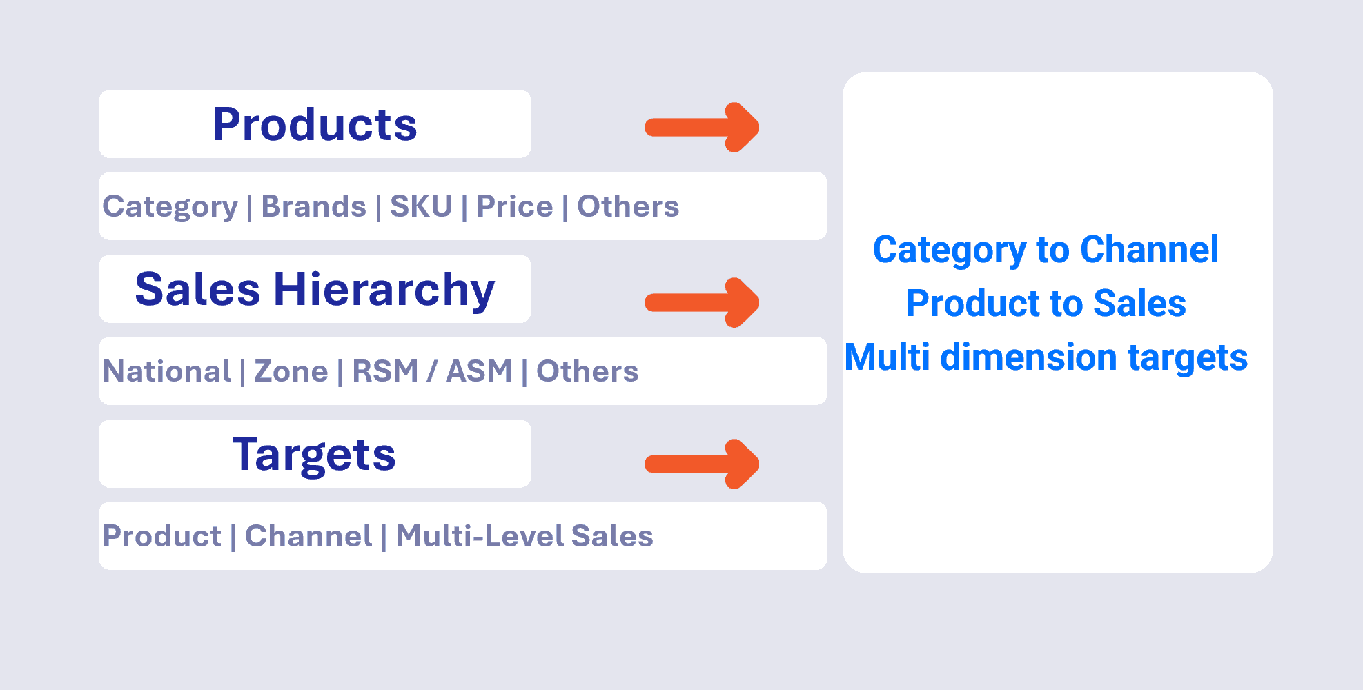 Manage product hierarchies, sales structures, targets, and category mappings across channels, without dependency on technical teams or schema rewrites.