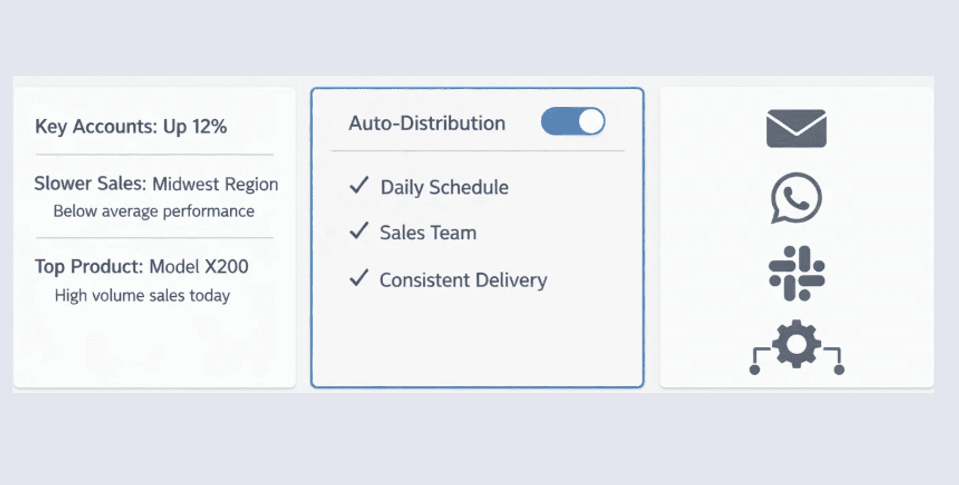 Your field teams need intelligence — not platform logins. Share insights via email, WhatsApp, Slack, or internal systems, automatically and consistently.